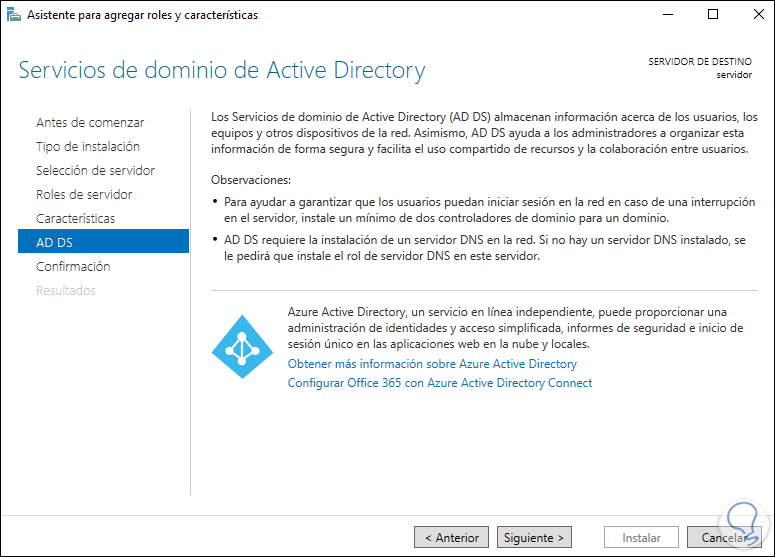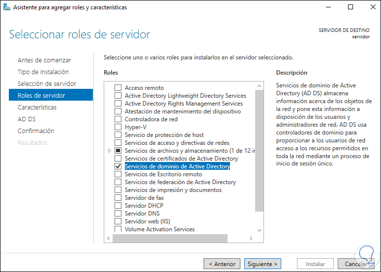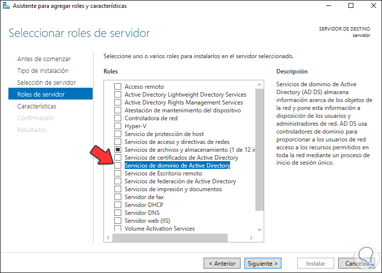 En la sección de “Roles de servidor” seleccionamos "Servicios de dominio de Active Directory":