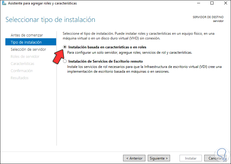 Damos clic en Siguiente y activamos la casilla "Instalación basada en características o en roles":