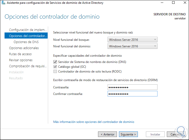 Clic en Siguiente para definir el nivel funcional e ingresar la contraseña DSRM: